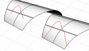 Mit dem Befehl KurveAufFlächeVerlängern wird eine Kurve auf einer Fläche bis zur angegebenen Flächenkante hin verlängert.