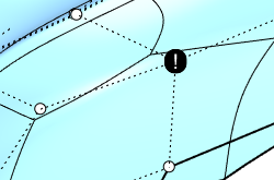 Wenn das Einsetzen von Kanten fehlschlägt, wird die fehlerhafte Geometrie mit einem Textpunkt markiert. Der Zusatztext in den Textpunkteigenschaften gibt einen Hinweis darauf, was zu reparieren wäre.