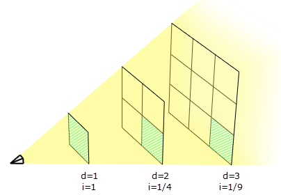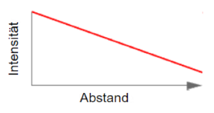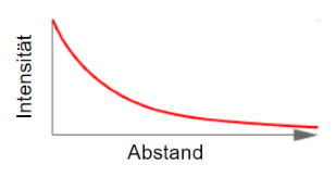 Lichtintensität verringert sich nach dem Abstandsgesetz (1/d2).