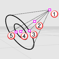 Standortpunkt (1), Dolly-Punkt (2), Radiussteuerung (3), Zielpunkt (4), Hotspot-Steuerung (5).