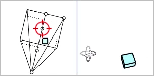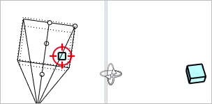 Der rechteckige Kegel links repräsentiert die Ansichtskamera des rechten Ansichtsfensters.Die rechte Ansicht wird um den Zielpunkt ihrer Ansichtskamera gedreht.