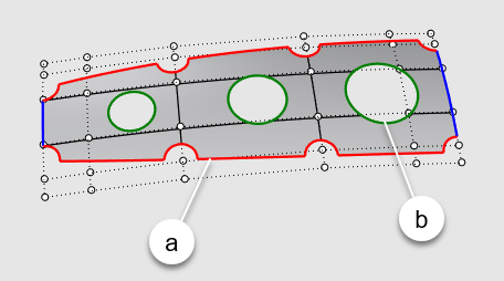 Eine getrimmte Fläche besteht aus zwei Teilen: einer Fläche, die allem zu Grunde liegt, was die geometrische Form definiert; und Trimmkurven, die entweder den äußeren Teil der Fläche wegtrimmen oder Löcher in das Innere schneiden.