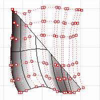 Wenn eine Trimmkurve diagonal über eine Fläche verläuft, hat die Trimmkurve keine echte Beziehung zur Kontrollpunktstruktur der Fläche. Sie können das sehen, wenn Sie eine solche getrimmte Fläche auswählen und ihre Kontrollpunkte aktivieren. Sie sehen dann die Kontrollpunkte für die gesamte darunter liegende Fläche, die nicht unbedingt eine Beziehung zu den Trimmkurven haben muss.