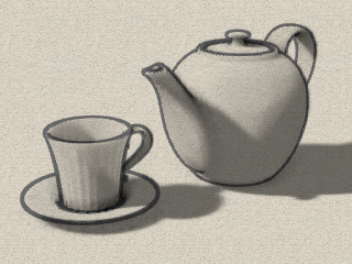 Alle Objekte werden weiß mit grauer Schattierung, schwarzen Silhouetten und Kanten angezeigt.