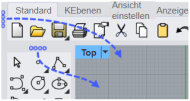 Rhino wird mit dem standardmäßigen Werkzeugleisten-Layout geöffnet. Das standardmäßige Werkzeugleisten-Layout zeigt nur einige der vielen Rhino-Werkzeugleistengruppen an. Einige der ausgeblendeten Werkzeugleisten können mit den Schaltflächen im standardmäßigen Werkzeugleisten-Layout geöffnet werden. Die Werkzeugleiste auf der linken Seitenleiste kann sich verändern, wenn Sie auf eine mit einer anderen Werkzeugleiste verknüpfte Werkzeugleiste klicken.