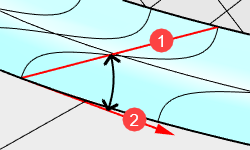 Si el ángulo entre la dirección isocurva (1) y la dirección tangente al carril (2) es inferior al umbral de ángulo, se añadirá una forma. Cuando se añade una forma, la superficie se reconstruye y se vuelve a calcular.