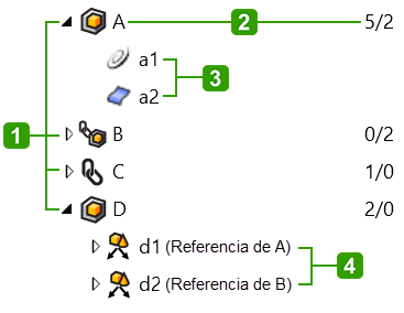 En este ejemplo, el Bloque A contiene un cilindro y una caja. El Color de visualización de la caja es Por objeto principal y lo controla el objeto principal (Bloque A). La caja mostrará el color de capa del Bloque A porque el color de visualización del Bloque A esPor capa. El cilindro siempre mostrará su propio color de capa y el Bloque A no lo cambiará.