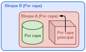 Ahora el Bloque A está anidado en el Bloque B. La caja todavía muestra el color de capa del Bloque A porque Por objeto principal solo funciona con el objeto principal directo.