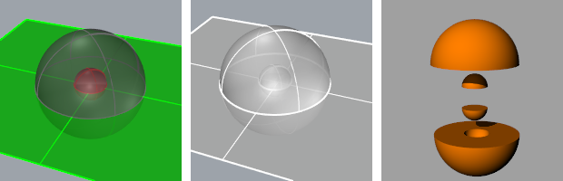 Dos esferas y un plano (izquierda), después de FusiónNoMúltiple (medio), vista descompuesta después de CrearRegiones (derecha).