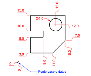 - Este tipo de cotas evita que se acumulen errores mostrando el desfase X o Y de la característica desde el punto base.