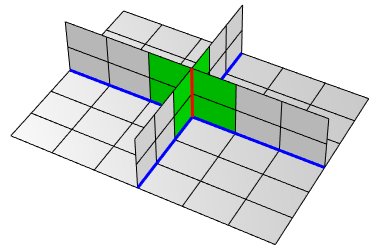En la ilustración, cada borde rojo es compartido por cuatro caras. Cada borde azul es compartido por tres caras. Cuando la opción MínimoNúmeroDeCaras=4, solo se extraen las caras alrededor de los bordes rojos.