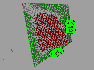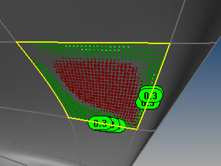 El comando AplanarAvanzado marca áreas de compresión con una nube de puntos rojos y áreas de estiramiento con una nube de puntos verdes y muestra estadísticas sobre la cantidad de compresión o de estiramiento. Pueden incluirse hasta diez puntos, que marcan las posiciones con la máxima deformación. El número del punto de texto es el porcentaje de cambio de longitud.