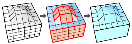Mantiene los NGonos y convierte cada región plana con (rojo) en un ngono. La región plana (azul) con contorno interior no se convertirá.
