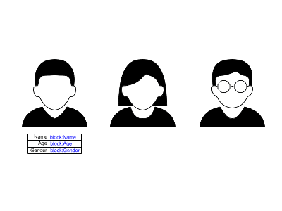 En este ejemplo, se crea una definición de bloque "Tabla de datos" a partir de la tabla que contiene cadenas de texto de atributos de bloque para el nombre, la edad y el sexo.