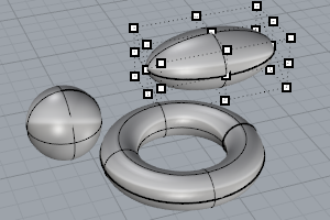 Una sola superficie puede envolverse y unirse a sí misma. Algunos comandos de ejemplo son Esfera, Toroide y Elipsoide. Los puntos de control pueden activarse en sólidos de una superficie y moverse para modificar la superficie.