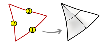 Closed three-curve input creates a three-sided surface with a singularity point located opposite the first selected curve.