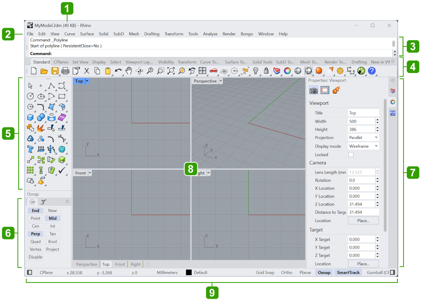 The image below illustrates some of the major features of the Rhino window.